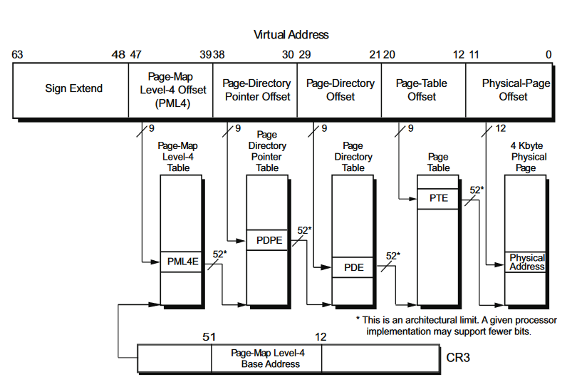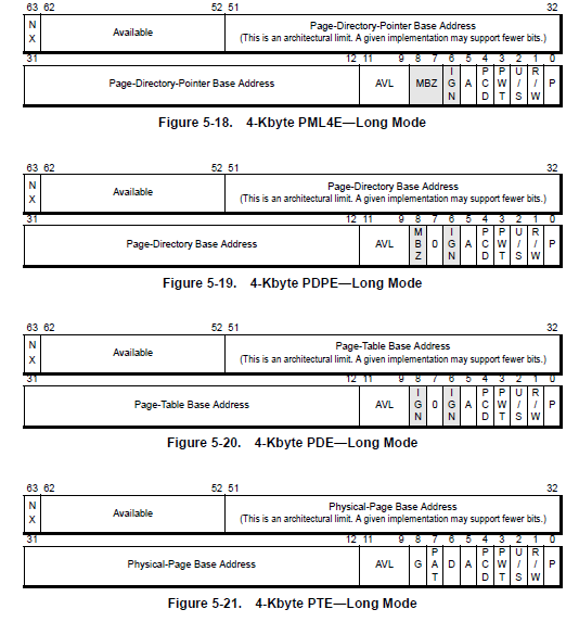 NOTE: In the Intel’s Manual the terms are slighty different. for example, what in Linux is called PGD, here receives the name of PML4T.