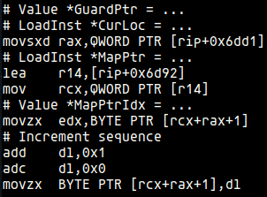 Looking at the InjectCoverageAtBlock function’s code, we find several IRBuilder (IRB) variables that correspond directly to assembly instructions. They can be summarized as follows: