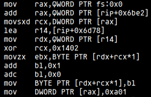 The instructions add bl, 0x1 followed by adc bl, 0 ensure that if the counter at __afl_area_ptr[idx] reaches 255 and wraps, the carry flag forces the value back to 1 instead of 0. In decompiled form this appears as __afl_area_ptr[idx] = __afl_area_ptr[idx] + 1 + (0xfe < __afl_area_ptr[idx])