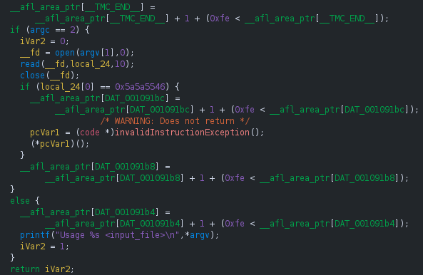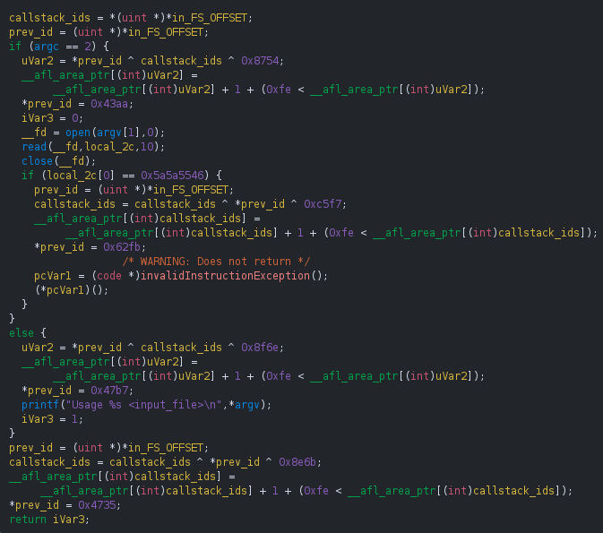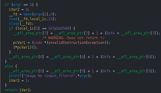 If we open the compiled binary in ghidra, we can observe that the inlined code is a little bit different: the index into __afl_area_ptr is an immediate instead of a variable.