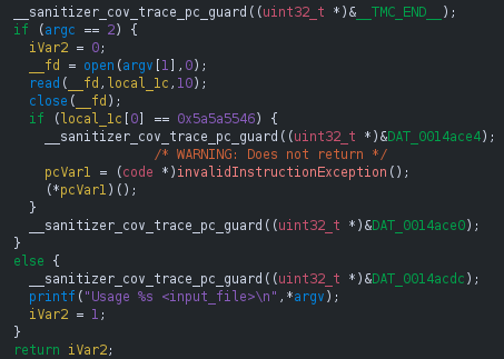 If we open the compiled binary in ghidra, we can observe that calls to the function __sanitizer_cov_trace_pc_guard(uint32_t *guard) have been inlined.