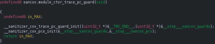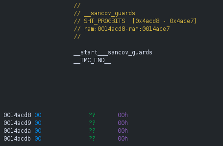 As you may have noticed, each call passes the address of a unique uint32_t guard variable that the compiler emits for every instrumented edge. These guard variables are not placed in the usual .bss or .data segments, but instead collected in a dedicated section named __sancov_guards. At link time, the start and end of this section are exposed through the special symbols __start___sancov_guards and __stop___sancov_guards, so that all guards can be discovered as a contiguous array. If we follow the reference of one of the DAT_* reference, we end up in the __sancov_guards section: